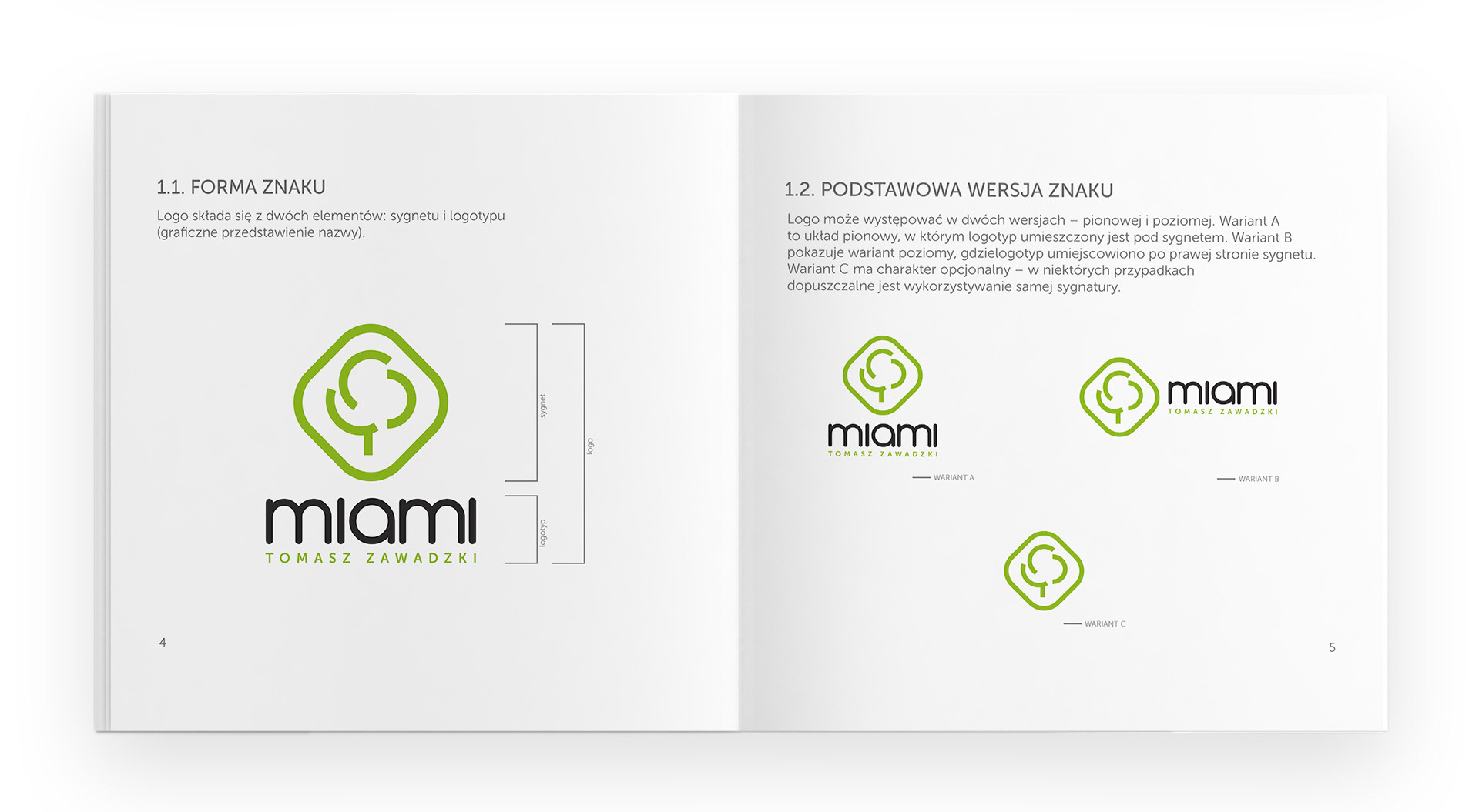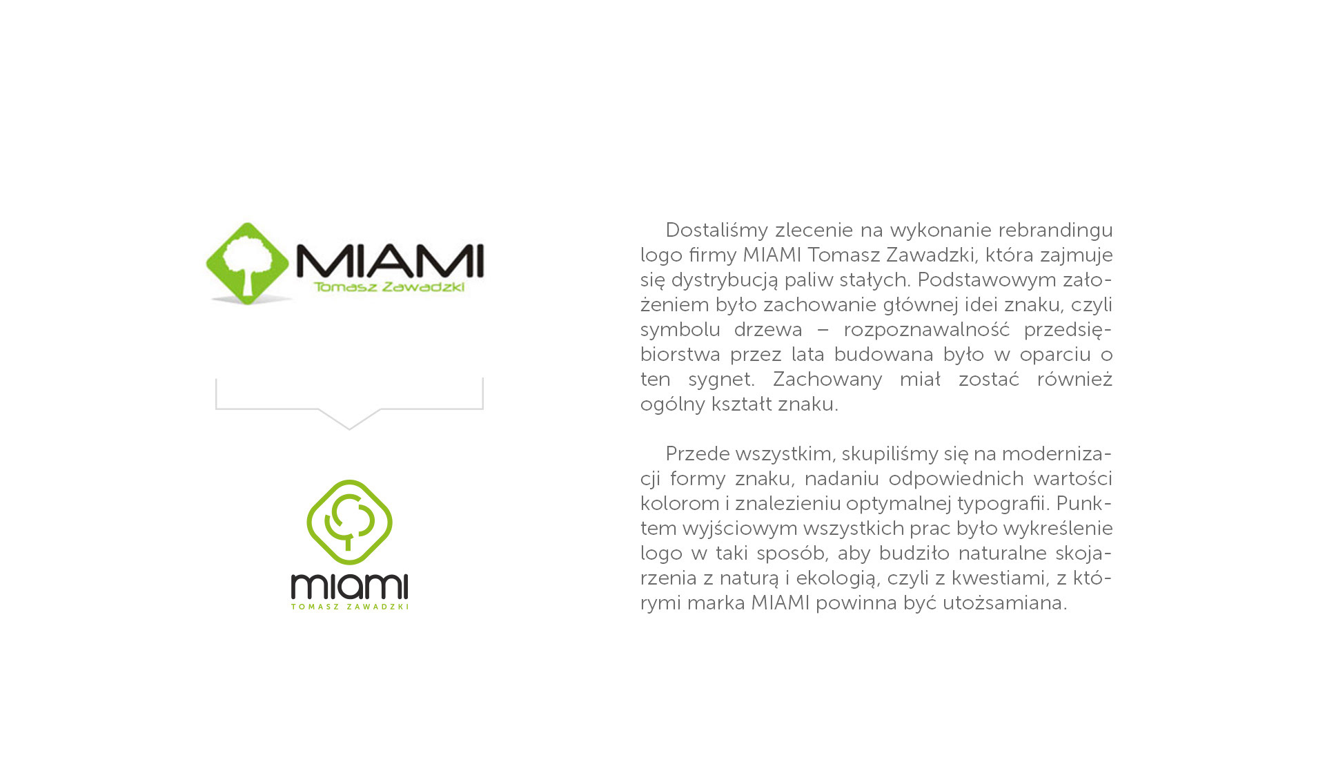 Otrzymaliśmy zlecenie na wykonanie re-brandingu logo firmy MIAMI Tomasz Zawadzki, która zajmuje się dystrybucją paliw stałych. Podstawowym założeniem było zachowanie głównej idei znaku, czyli symbolu drzewa – rozpoznawalność przedsiębiorstwa przez lata budowana było w oparciu o ten sygnet. Zachowany miał zostać również ogólny kształt znaku. Przede wszystkim, skupiliśmy się na modernizacji formy znaku, nadaniu odpowiednich wartości kolorom i znalezieniu optymalnej typografii. Punktem wyjściowym wszystkich prac było wykreślenie logo w taki sposób, aby budziło naturalne skojarzenia z naturą i ekologią, czyli z kwestiami, z którymi marka MIAMI powinna być utożsamiana.