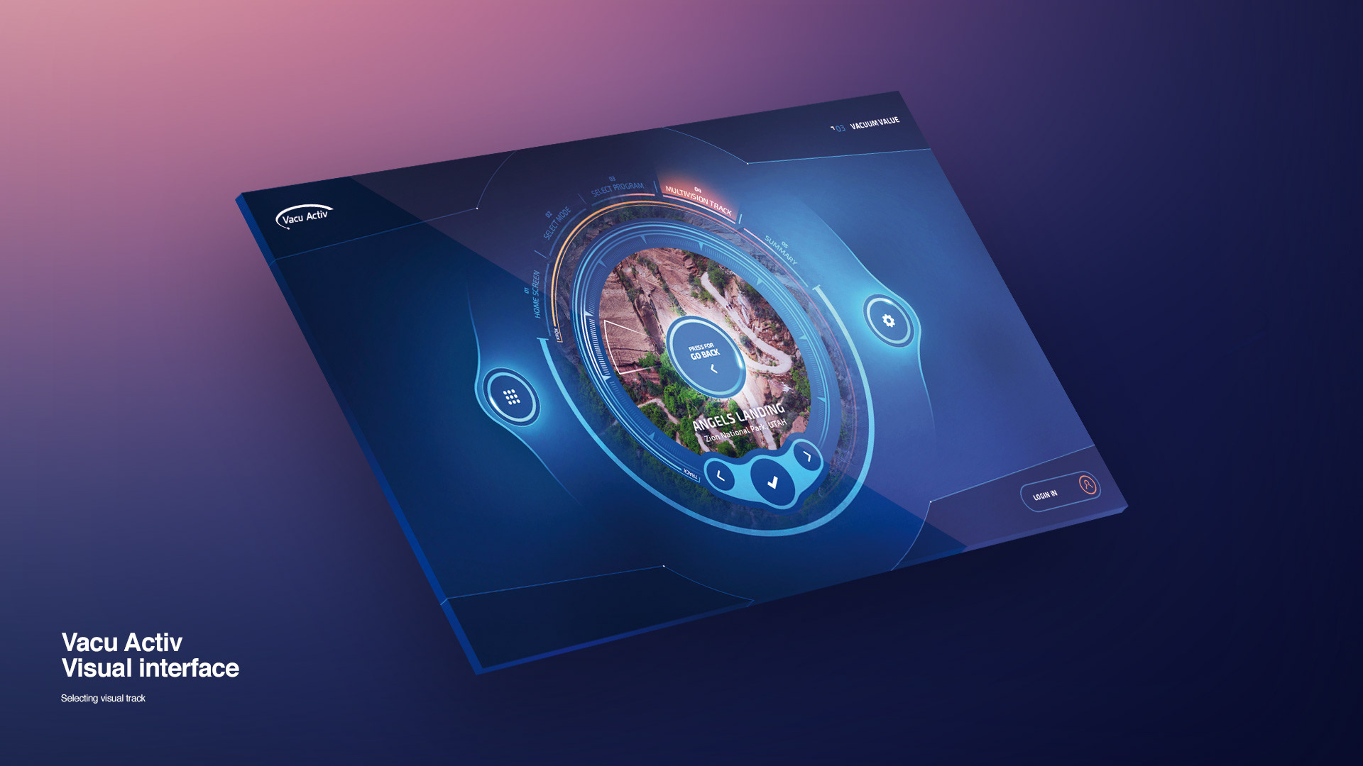 Projekt interfejsu graficznego dla ekranu dotykowego stworzony na potrzeby nowoczesnych kapsuł fitness produkowanych przez Vacu Activ.